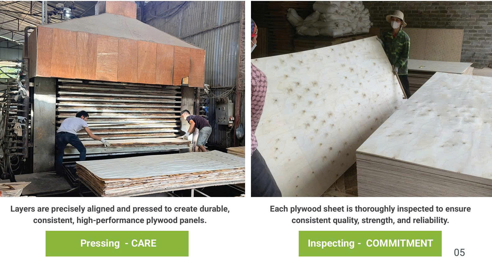 Chúng tôi không theo đuổi những cam kết mang tính hình thức hay tiêu chuẩn bề mặt. Thay vào đó là một sự nhất quán trong cách làm: mỗi tấm plywood trước khi xuất xưởng đều được kiểm soát, kiểm tra và đánh giá một cách cẩn trọng.